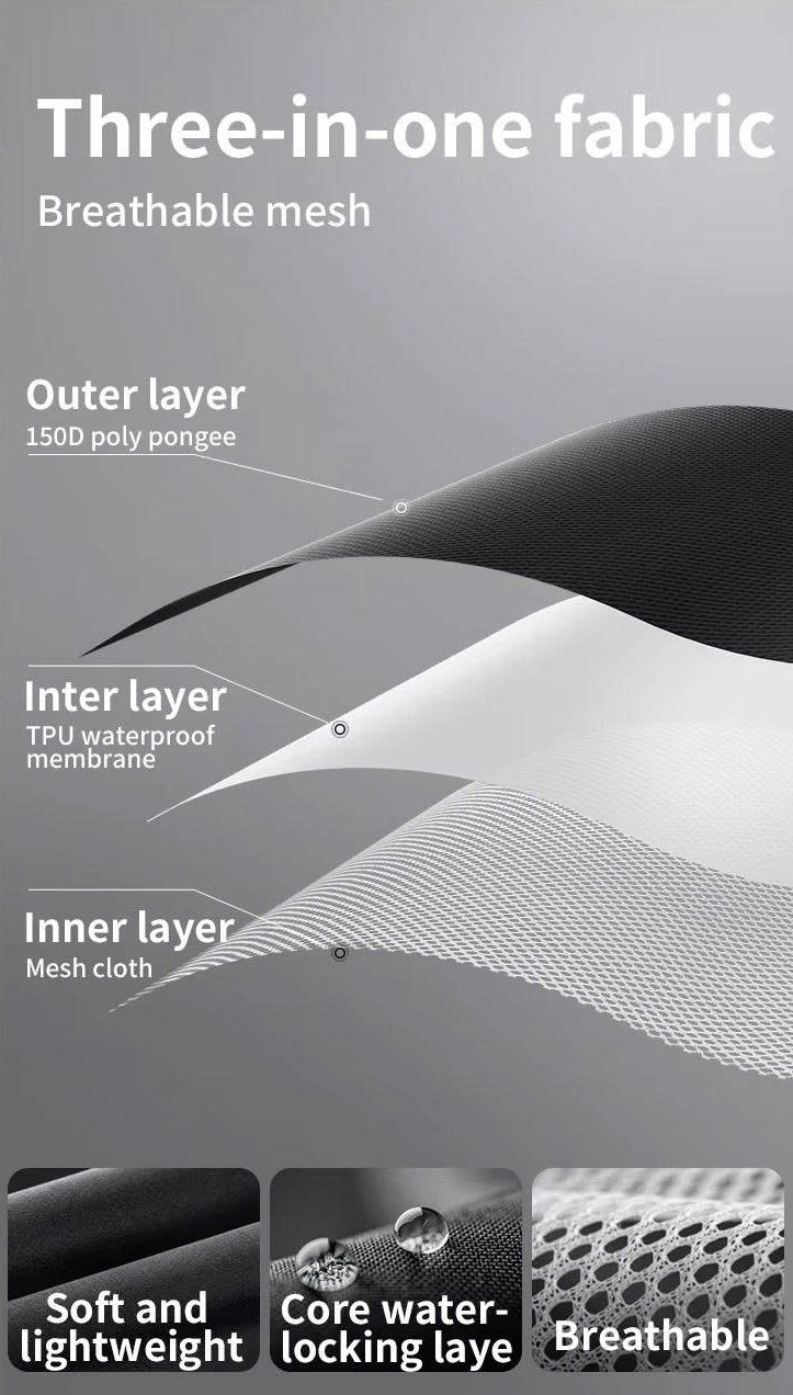 Thành Phần : Vải Poly 150D, màng chống thấm TPU và lưới thoáng khí. Độ kháng nước 10.000 colomn, level 3.