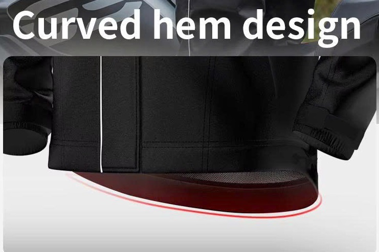 Thiết kế vạt áo dạng bầu, phía sau dài hơn phía trước. Đây là thiết kế phù hợp với người đi xe máy, giúp tăng khả năng chống nước khi chạy, ngồi xe nghiêng về phía trước. Vạt áo có dây rút hỗ trợ điều chỉnh kích thước cho người mặc. Mặc áo mưa nhưng vẫn gọn gàng và thời trang.