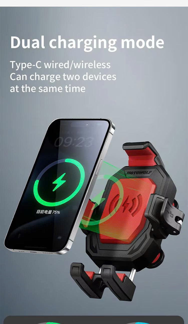 Với phân loại có sạc. Giá đỡ Motowolf MH2B được hãng tích hợp sạc đầu ra Type C và sạc không dây. Điện áp đầu ra sẽ là 36w (dùng dây) và 15w (không dây).